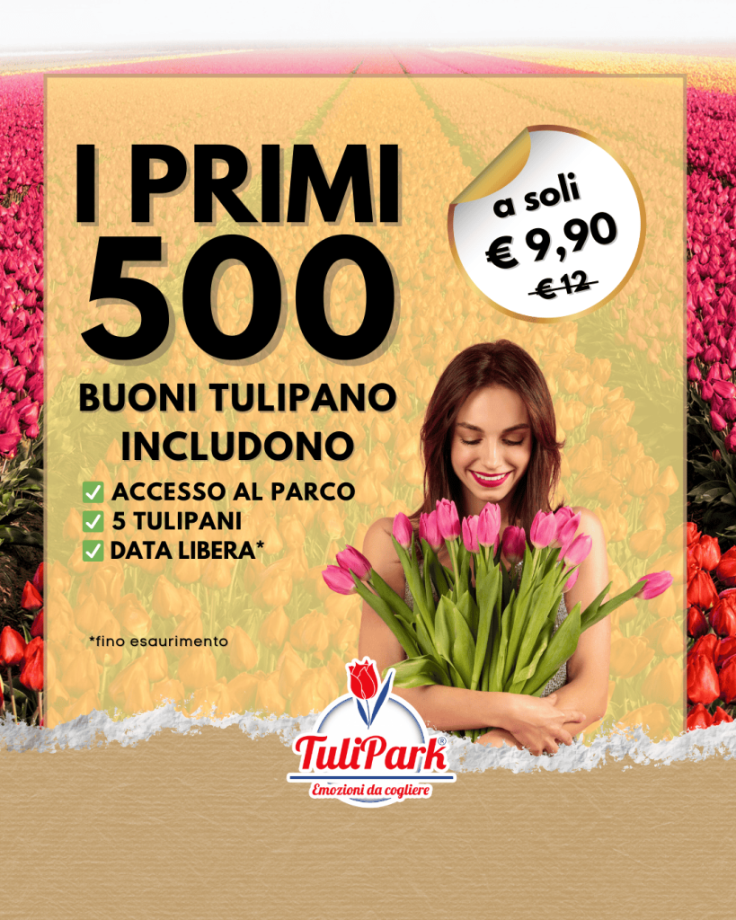 Mancano poche settimane all’apertura di TuliPark Caltagirone, e il vostro supporto è stato incredibile! Per ringraziarvi, offriamo in esclusiva ai nostri fan più fedeli i primi 500 buoni con 5 tulipani a soli €9.90! I buoni sono validi dal giorno di apertura del vivaio fino al 25 marzo.